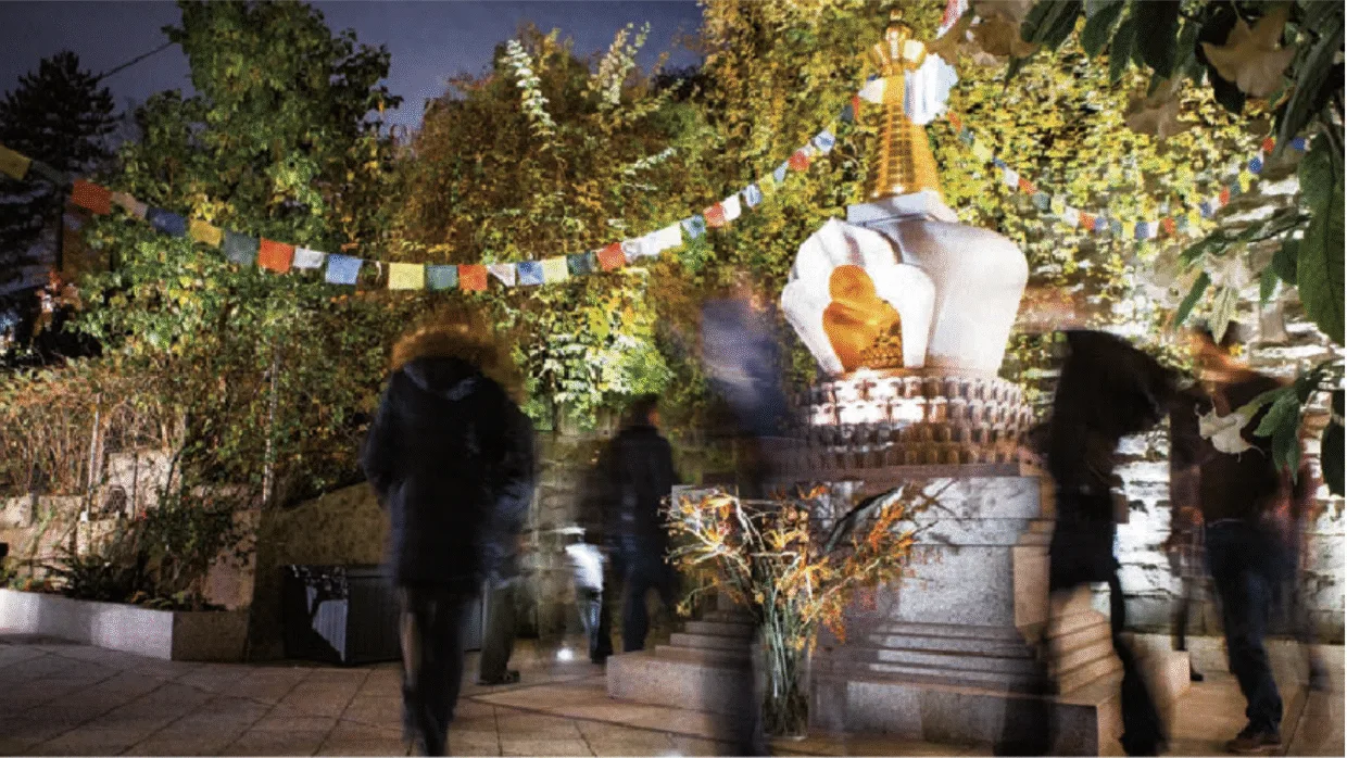 Die Lotusstupa im Hof ist öffentlich zugänglich und steht allen zum Besuch und für Meditationspraxis offen.